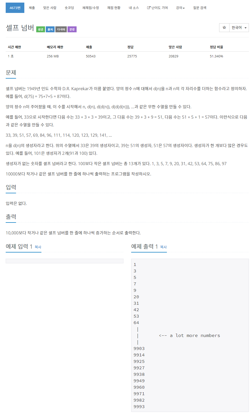 문제 셀프 넘버는 1949년 인도 수학자 D.R. Kaprekar가 이름 붙였다. 양의 정수 n에 대해서 d(n)을 n과 n의 각 자리수를 더하는 함수라고 정의하자. 예를 들어, d(75) = 75+7+5 = 87이다. 양의 정수 n이 주어졌�